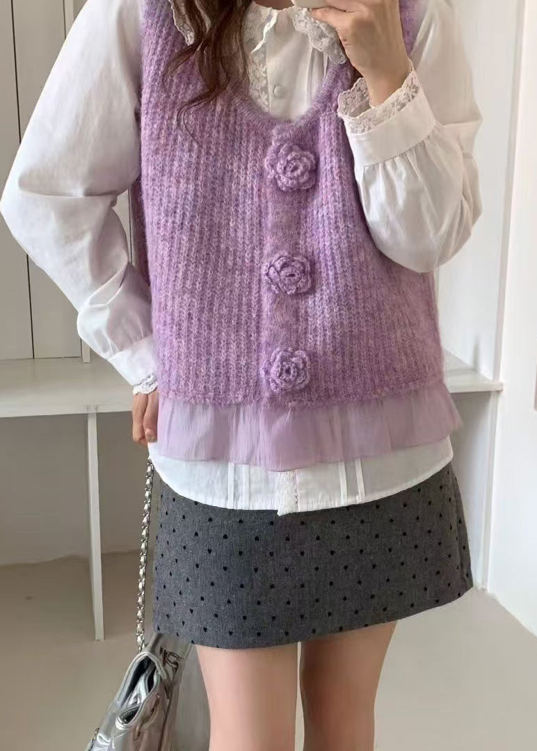 Purple Patchwork Knit Vests V Neck Floral Decorated Spring