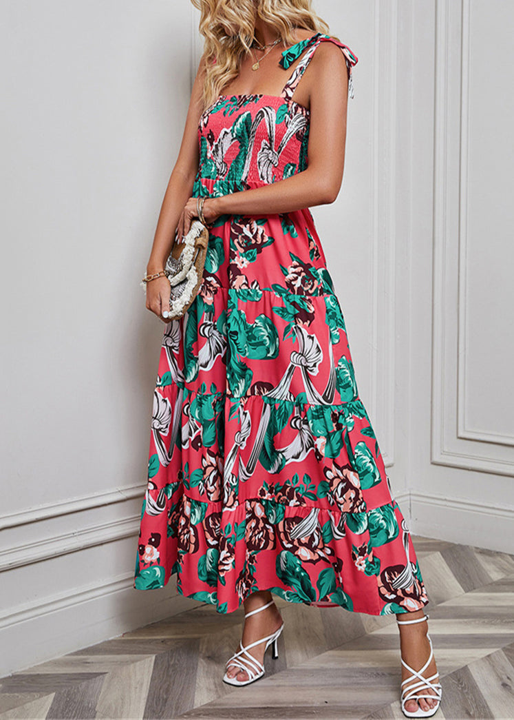 Red Lace Up Cotton Spaghetti Strap Dress High Waist Sleeveless