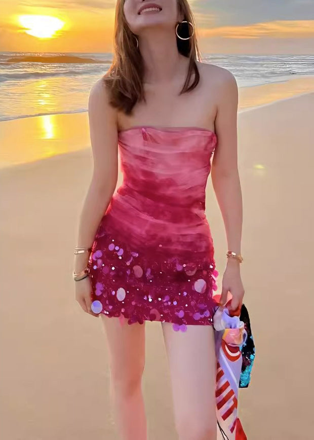 Slim Fit Red Strapless Sequins Cotton Mid Dress Sleeveless