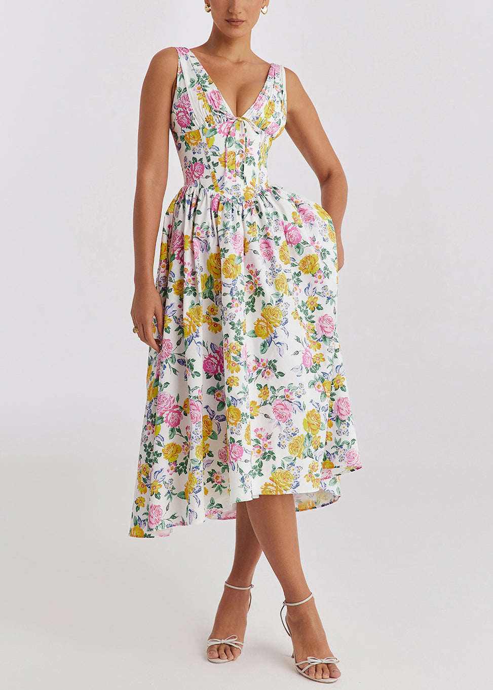 Slim Fit White V Neck Print Pockets Cotton Dresses Sleeveless