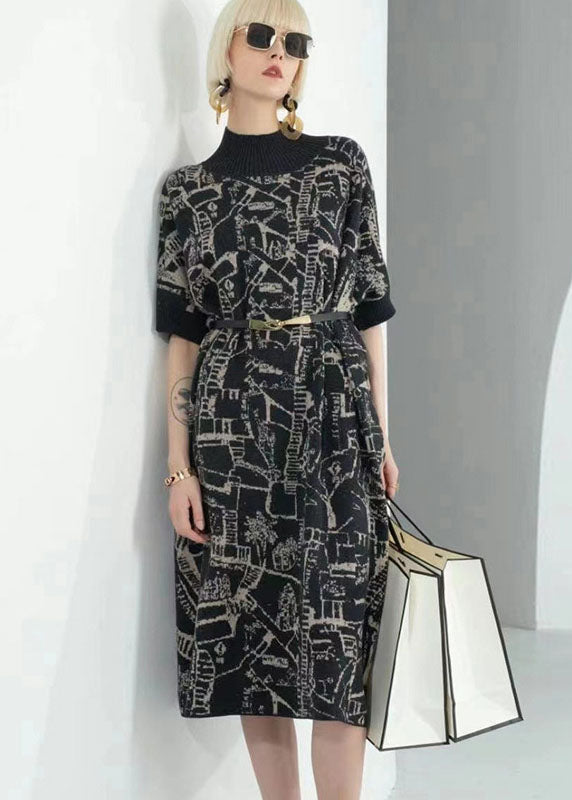 Style Grey Turtle Neck Print Wool Long Sweater Short Sleeve