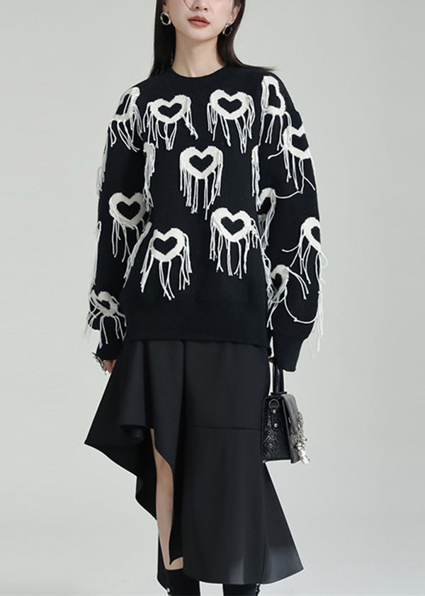Stylish Black Heart Tasseled Thick Patchwork Knit Sweaters Tops Fall