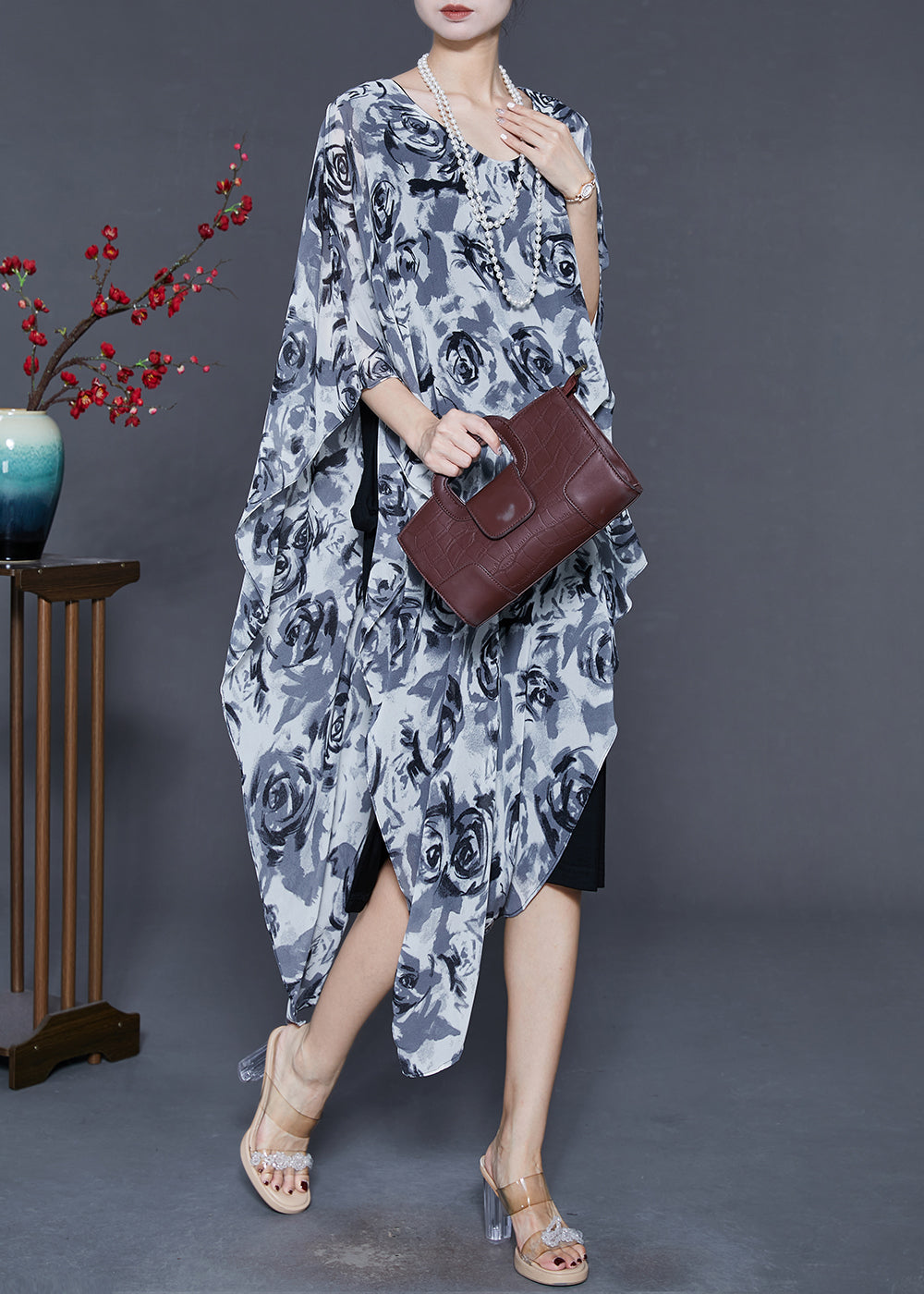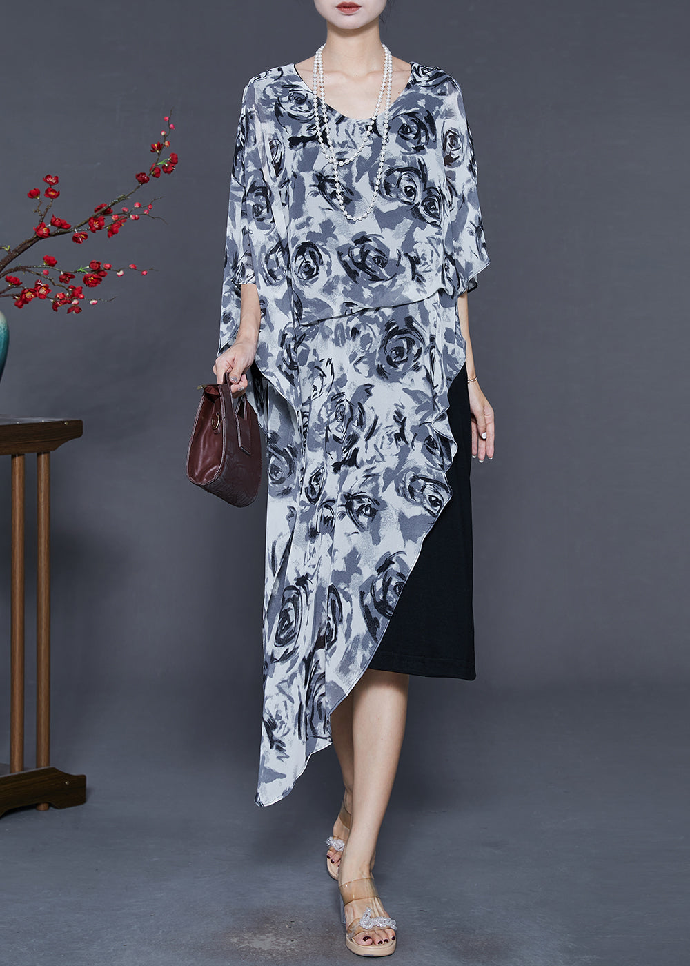 Stylish Grey Asymmetrical Floral Chiffon Tea Dress Summer