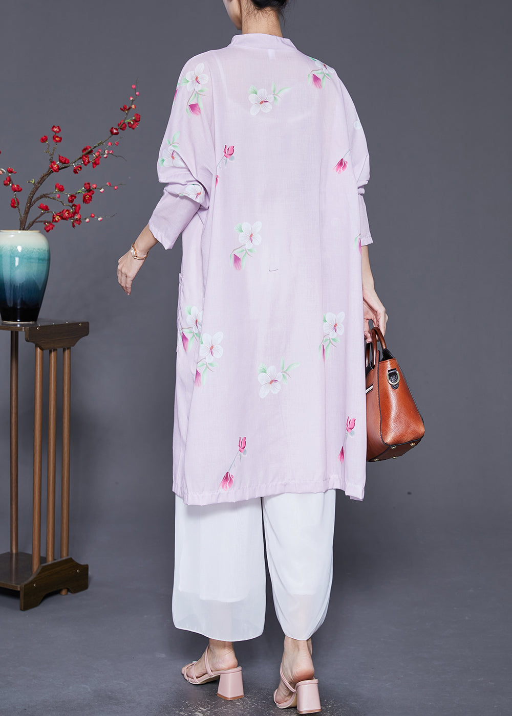 Vintage Light Purple Print Chinese Button Linen Shirt Dress Fall
