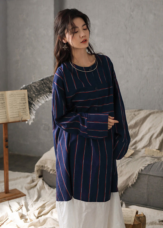 Vintage Navy Blue O-Neck Striped Patchwork Cozy Cotton Long Dress Long Sleeve
