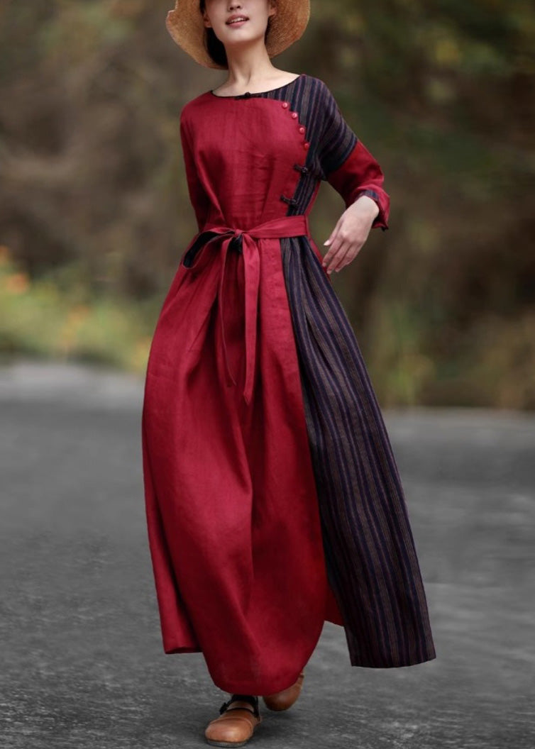 Vintage Red Pockets Tie Waist Patchwork Cotton Long Dresses Spring