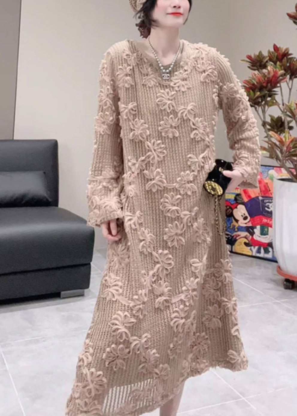 Vogue Black O-Neck Floral Hollow Out Maxi Dress Fall