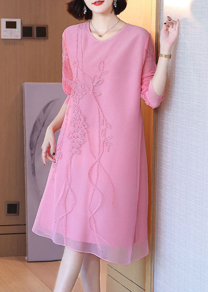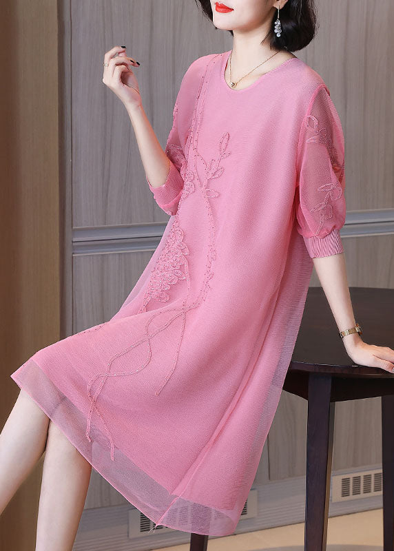 Vogue Green O-Neck Embroidered Holiday Tulle Mid Dress Fall