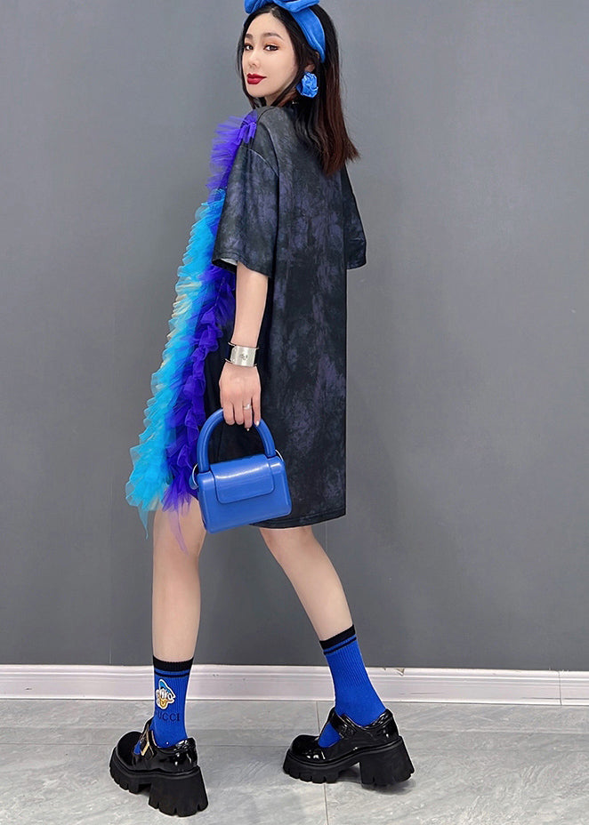 Women Black Asymmetrical Design Tulle Patchwork Print Dress Short Sleeve