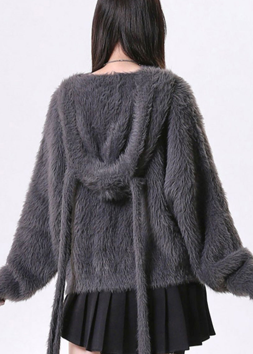 Women Dark Grey Oversized Bow Knit Rabbit Ears Hoodies Outwear Spring