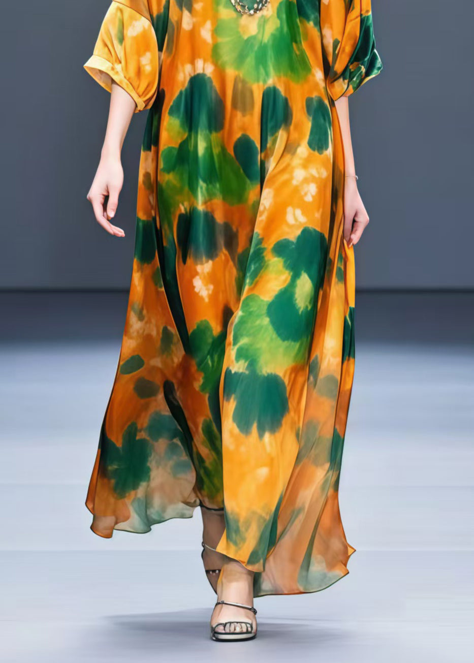 Women Orange Oversized Leaf Print Chiffon Dress Half Sleeve