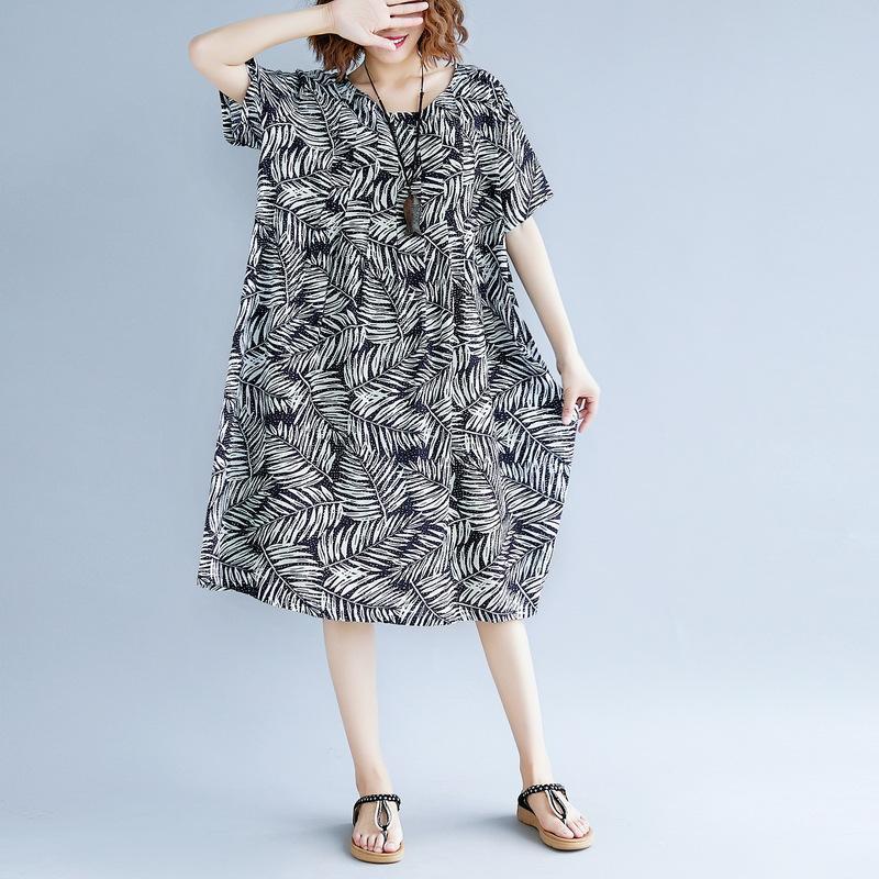 women print cotton linen dresses plus size clothing short sleeve baggy dresses New o neck traveling dress