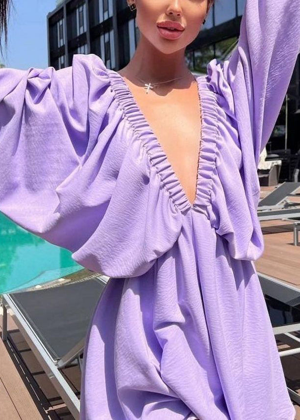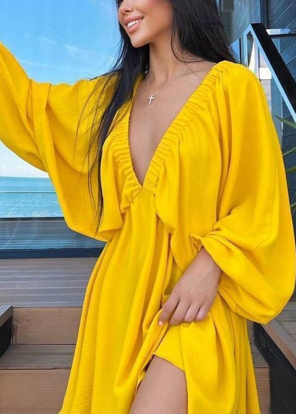 American Style Army Green V Neck Puff Sleeve Cotton Short Dress