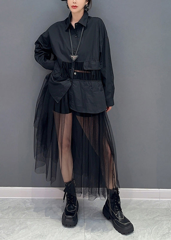 Art Black Peter Pan Collar Tulle Patchwork Hollow Out Cotton Dress Spring
