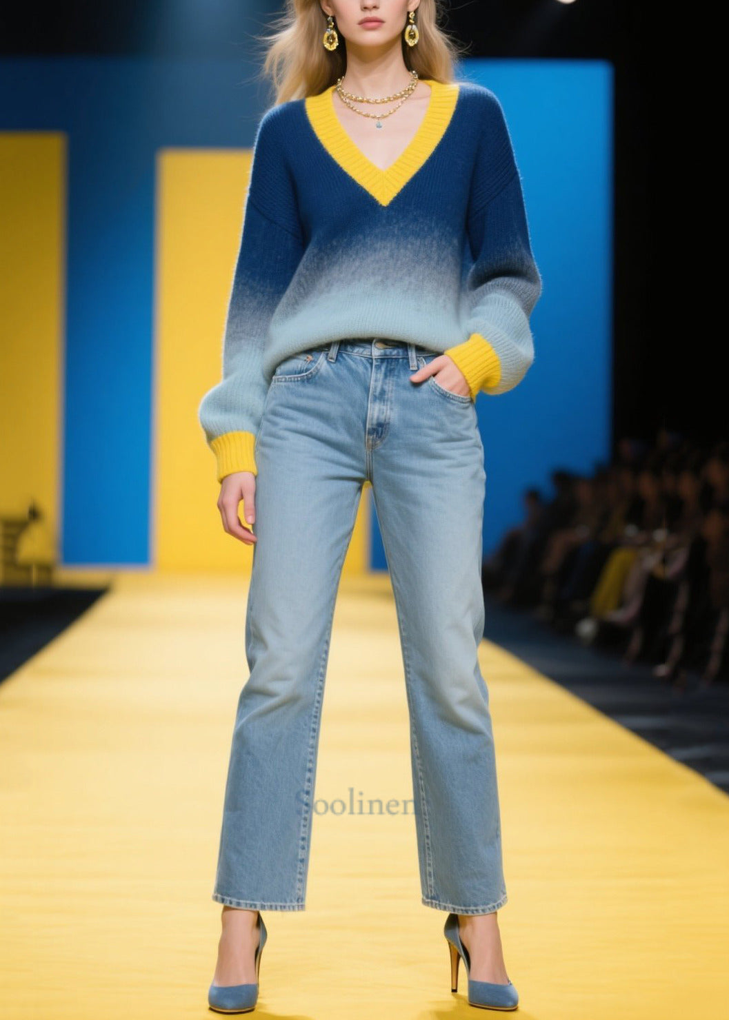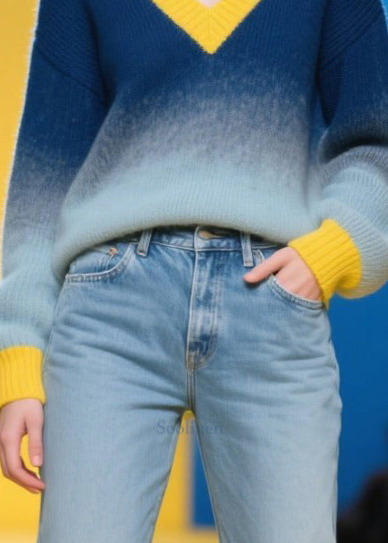 Art Gradient Color V Neck Patchwork Sweaters Winter