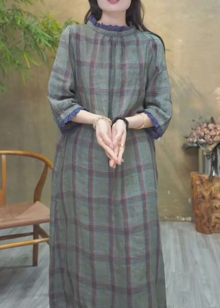 Art Plaid Ruffled Pockets Cotton Long Dress Bracelet Sleeve