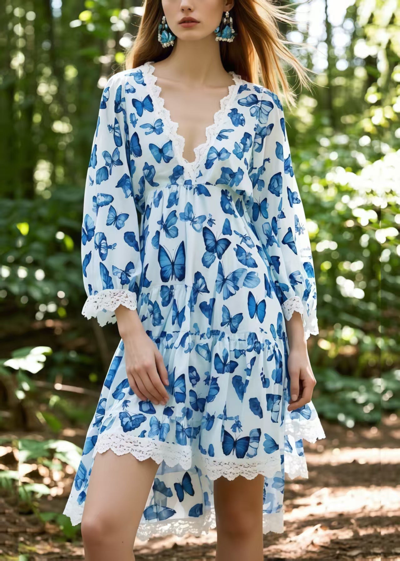 Blue Butterfly Cotton Day Dress Low High Design Bracelet Sleeve