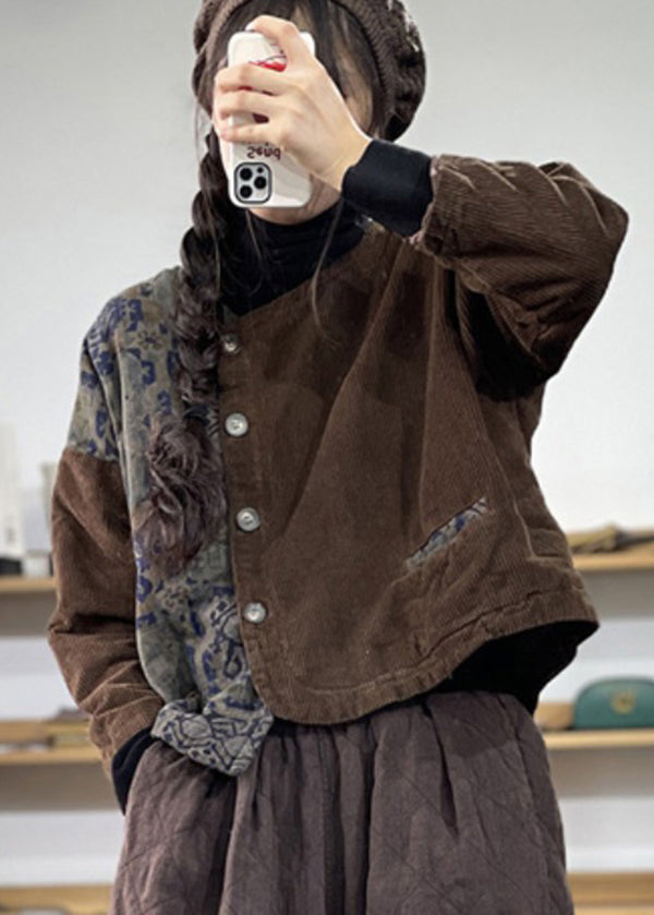 Bohemian Black Print Asymmetrical Corduroy Fine Cotton Filled Jacket Winter