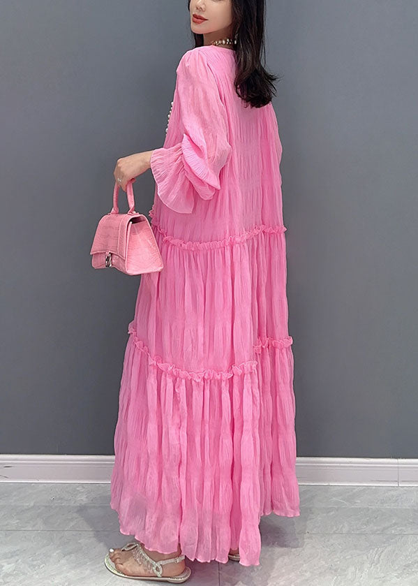 Bohemian Pink Ruffled Lace Up Patchwork Chiffon Long Dress Summer