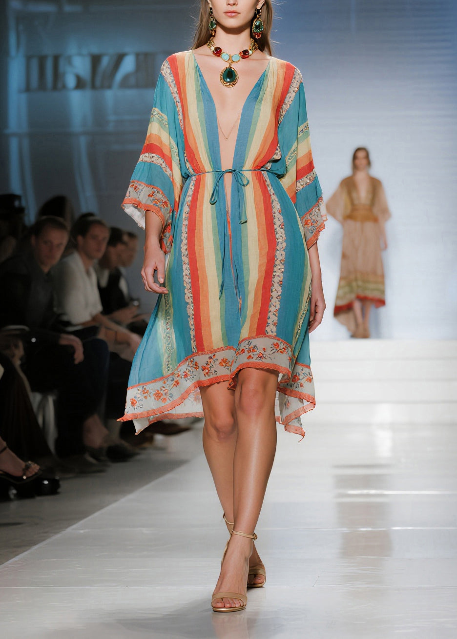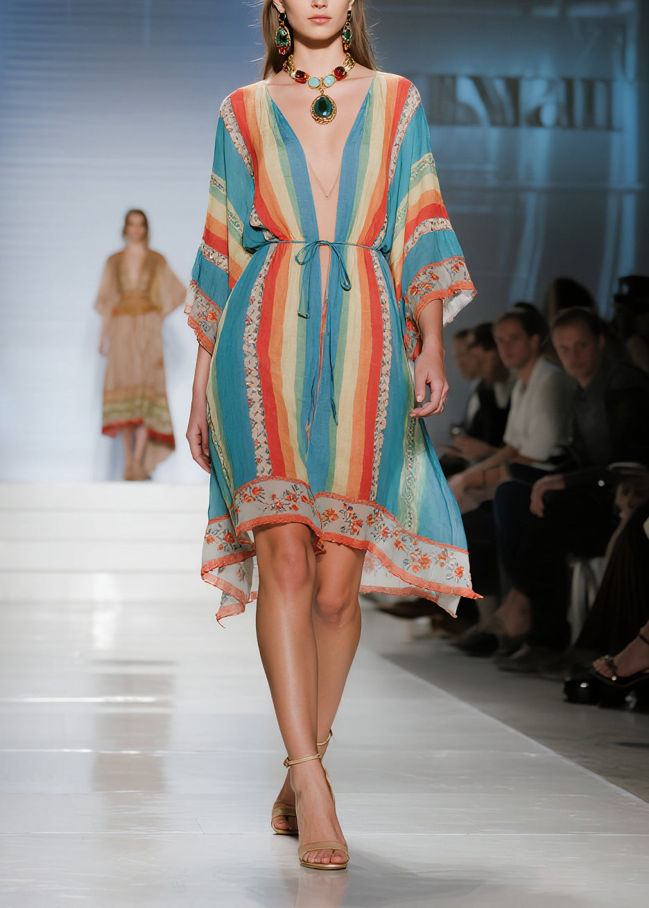 Boho Blue Tunic Striped Cotton Mini Dresses Summer