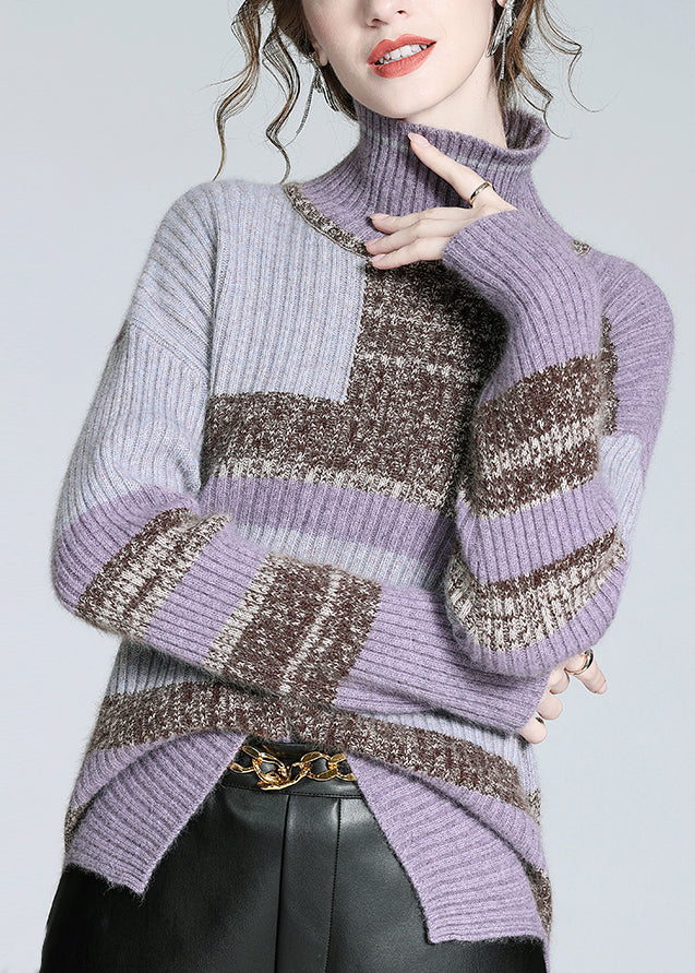 Boho Brown Turtleneck Patchwork Cashmere Knit Sweaters Winter