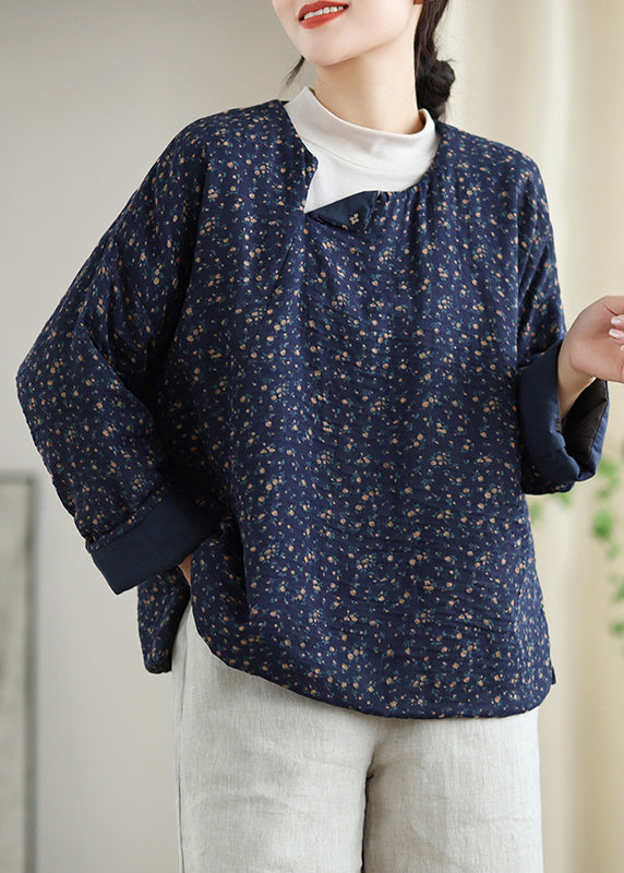 Boho Navy O Neck Print Plus Size Fine Cotton Filled Top Spring