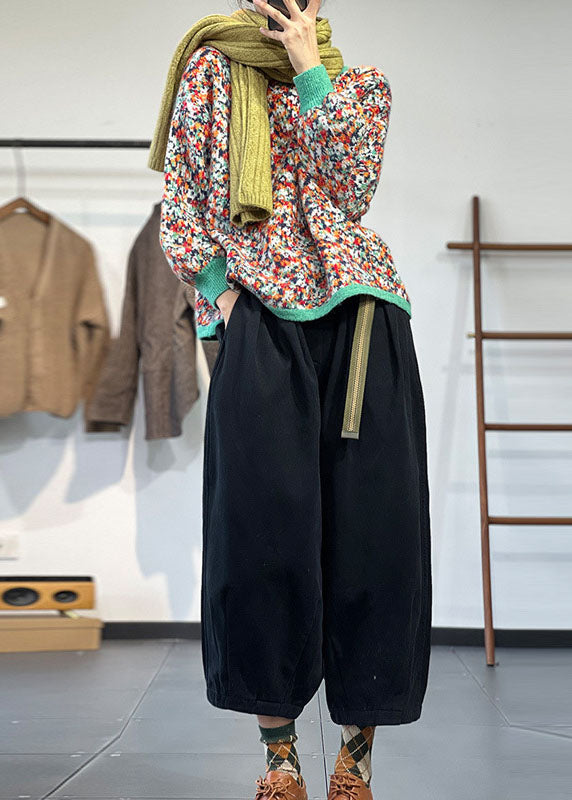 Boutique Green O-Neck Patchwork Chunky Oversized Print Knit Pullover Winter