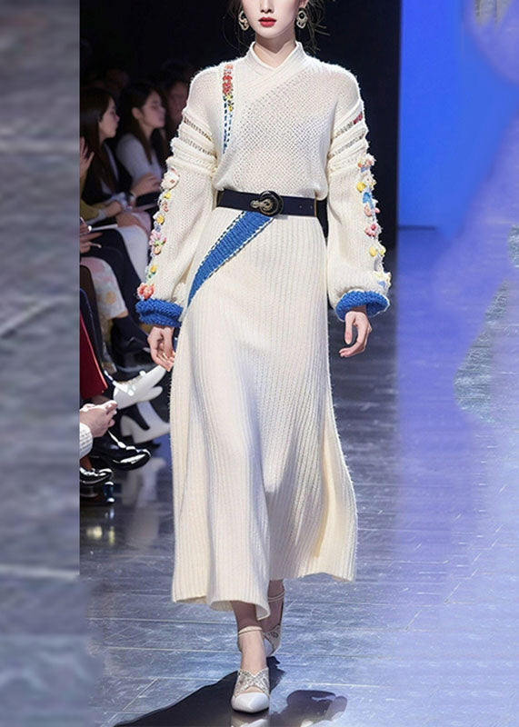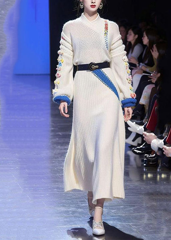 Brief White Stand Collar Floral Tie Waist Cotton Knit Sweater Dress Long Sleeve