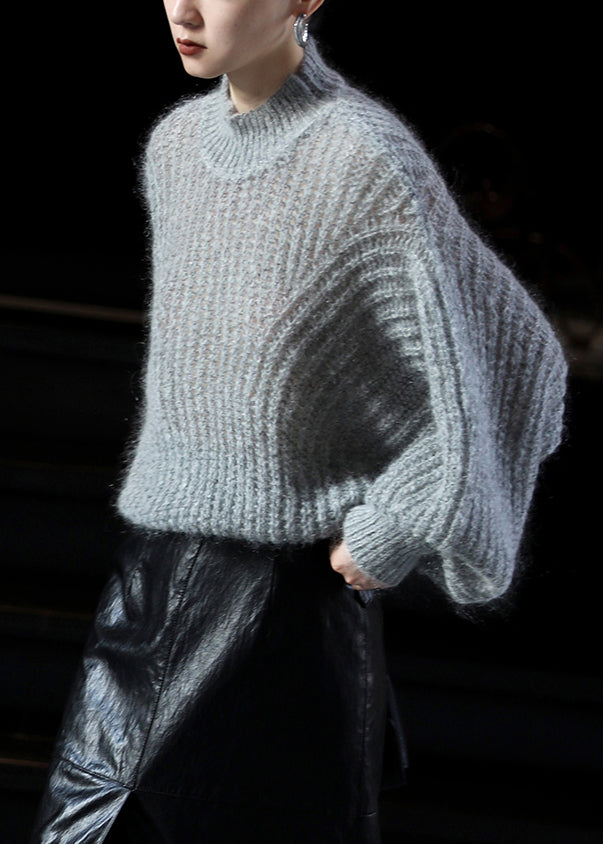 Casual Blue O-Neck Ma Hai mao Knit Sweater Lantern Sleeve