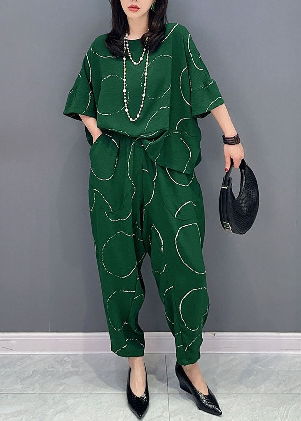 Casual Green O-Neck Print Tops And Pants Patchwork Cotton Two Pieces Set Summer