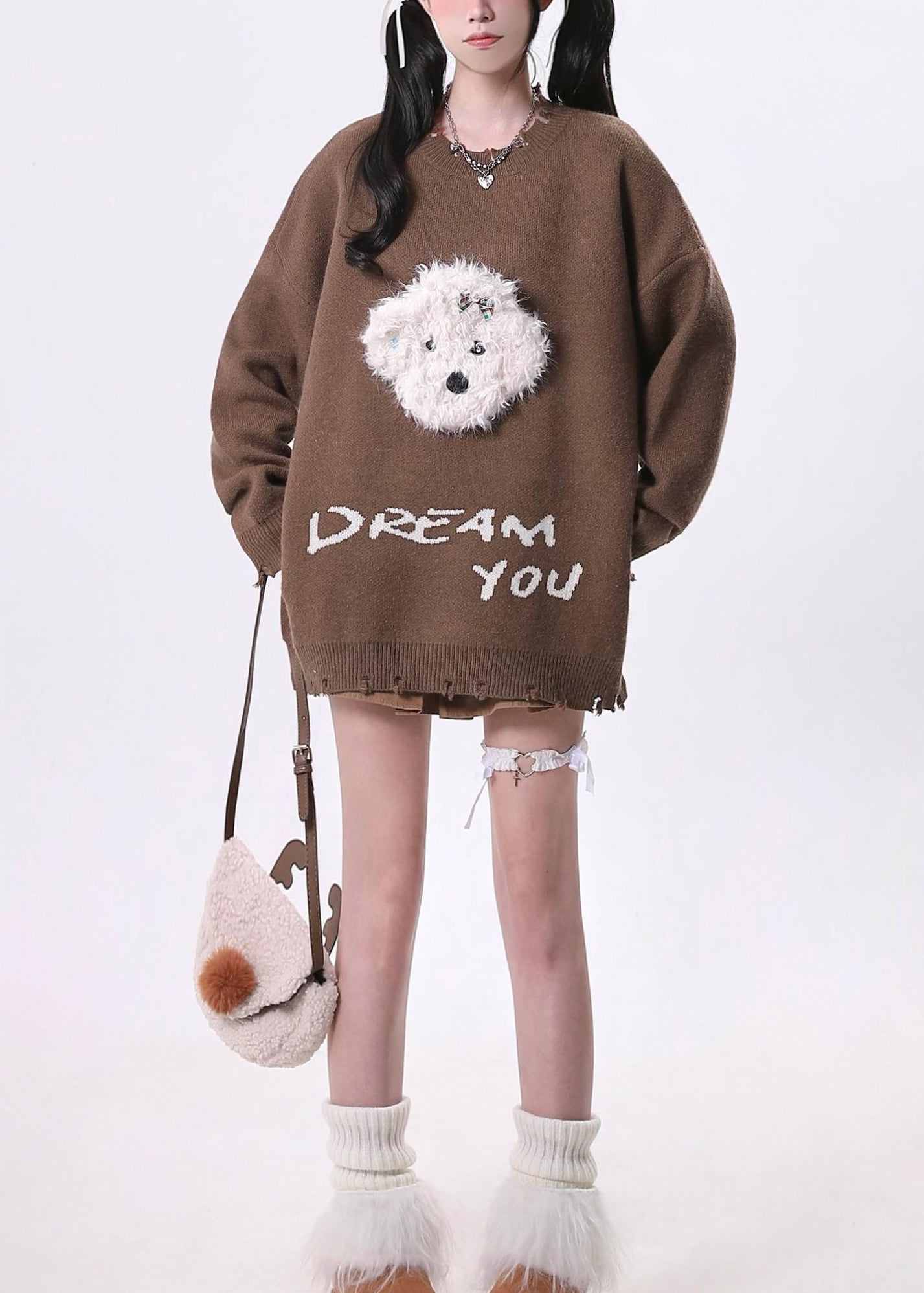 Casual Versatile Coffee O Neck Ripped Knit Sweater Tops Spring