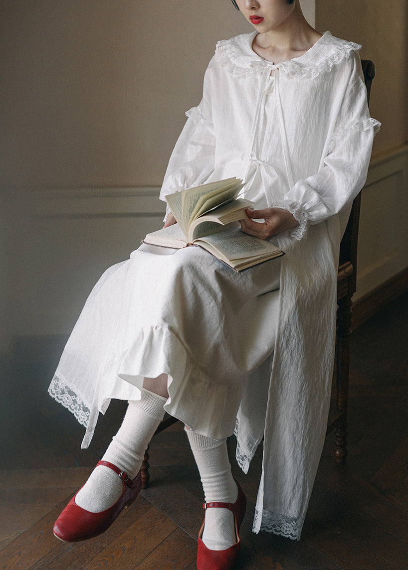 Chic White Ruffled Lace Patchwork Cotton Long Cardigan Fall