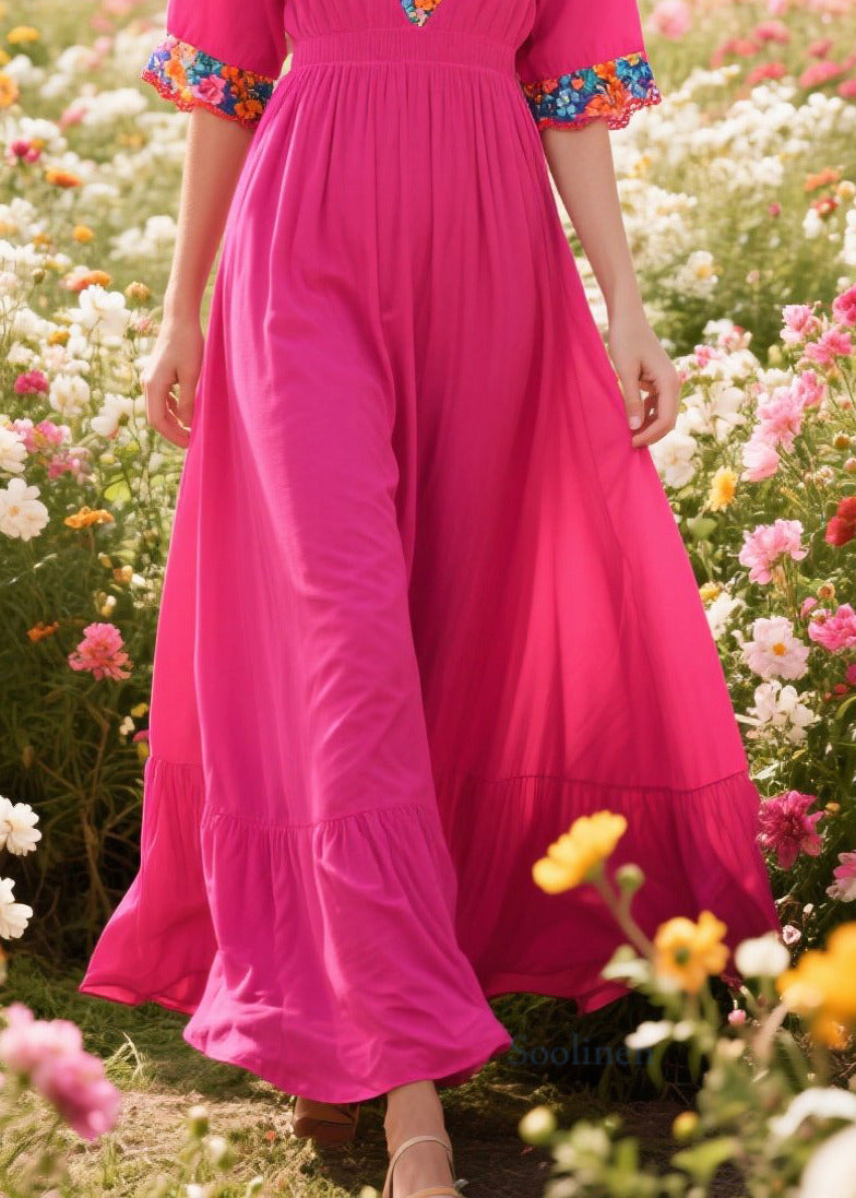 Classy Rose V Neck Patchwork Print Cotton Dresses Summer