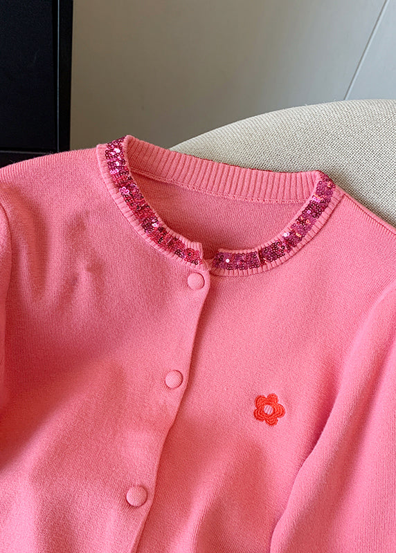 Cute Pink Embroidered Floral Sequins Cotton Knit Cardigans Fall