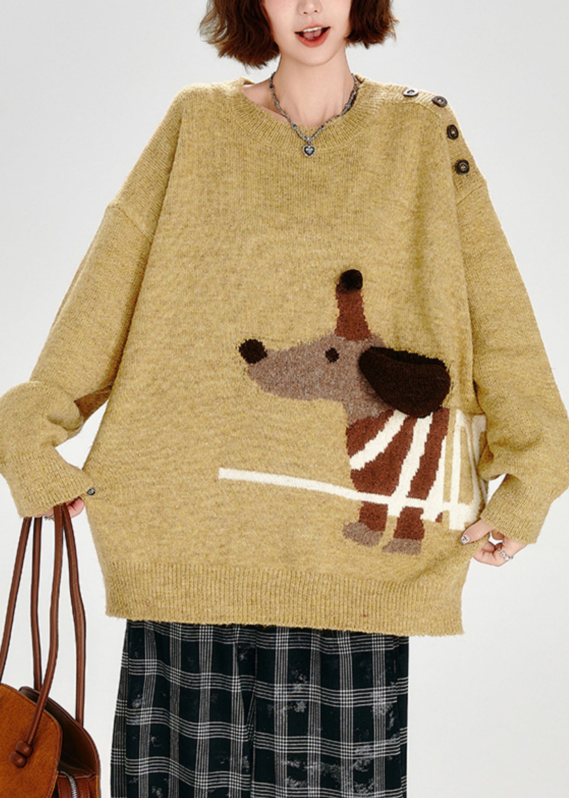 DIY Yellow Asymmetrical Dog Jacquard Knit Sweater Tops Winter