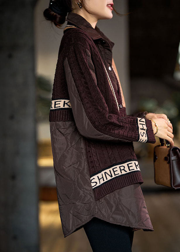 Elegant Coffee Peter Pan Collar Knit Patchwork Fine Cotton Filled Shirt Top Winter