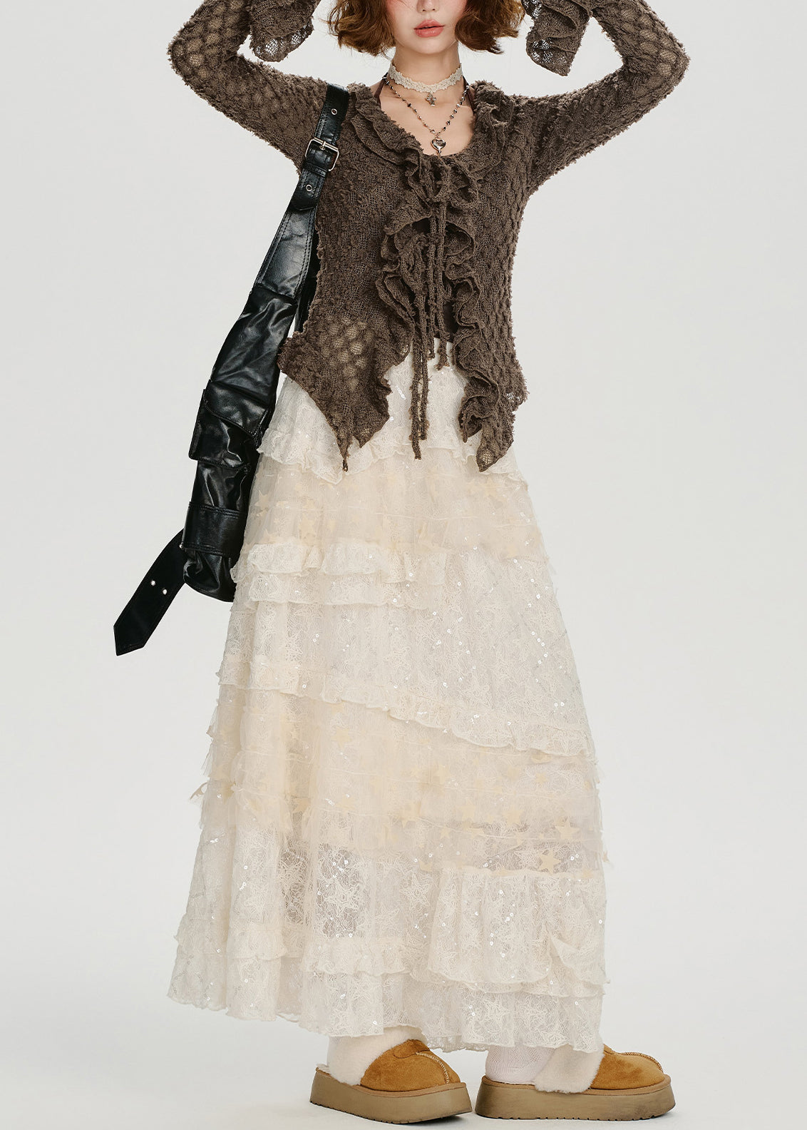 Elegant Coffee Ruffled Hollow Out Knit Shirts Flare Sleeve