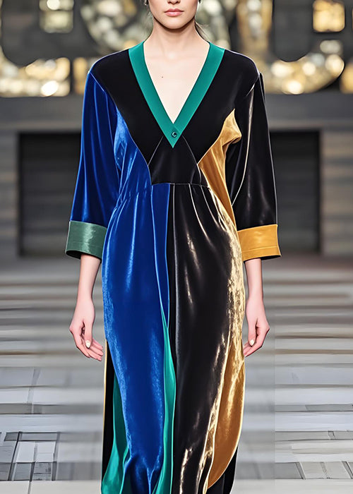 Elegant Colorblock V Neck Loose Velvet Long Dresses Fall