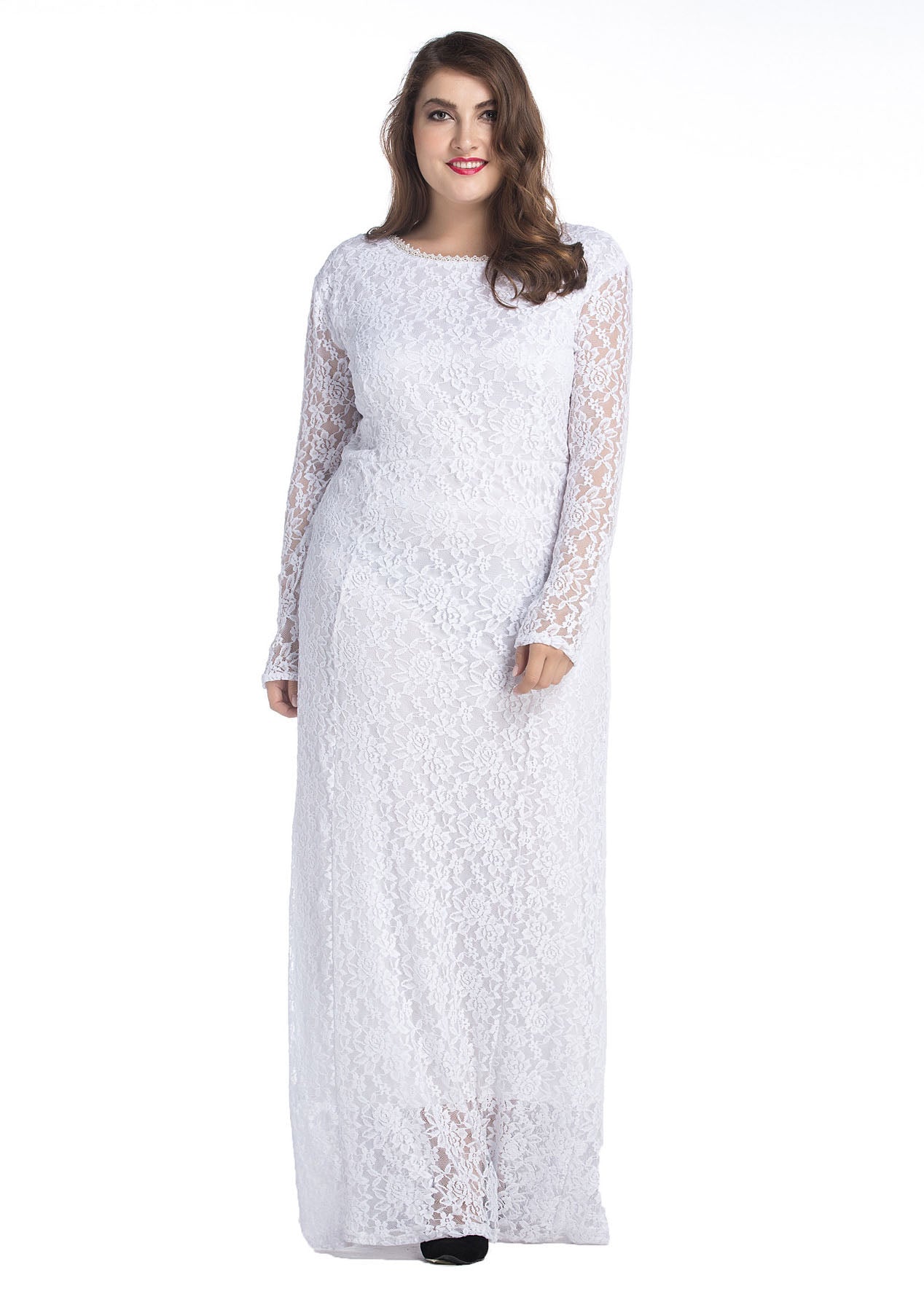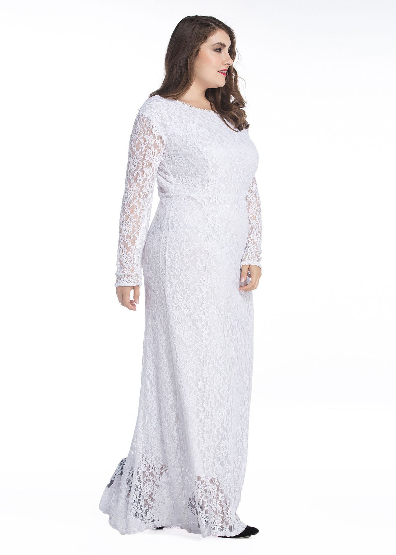 Приталенное белое кружевное платье с круглым вырезом и длинным рукавом в технике пэчворк