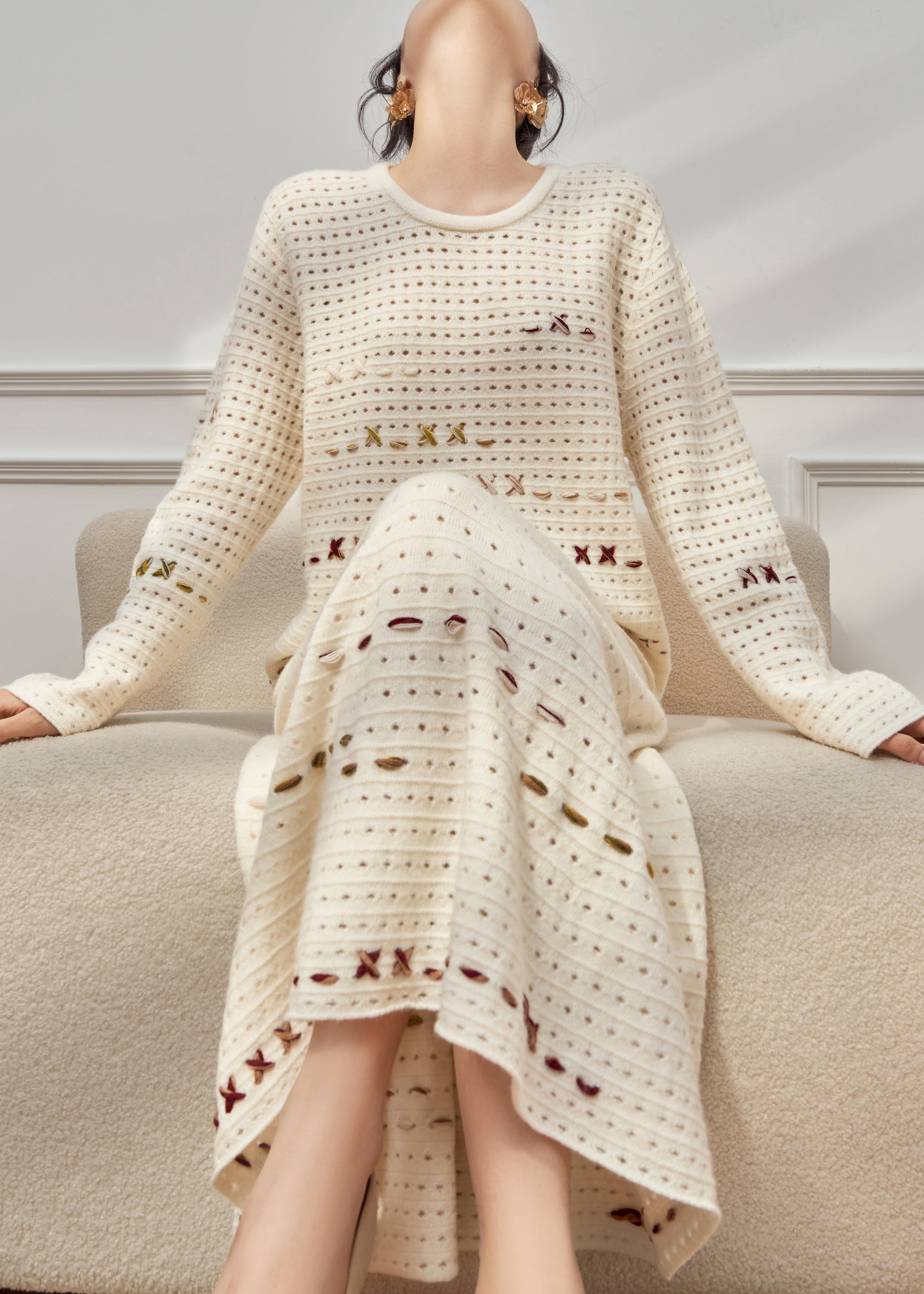 French Beige Hollow Out Sweaters And Skirts Knit Two Pieces Set Fall