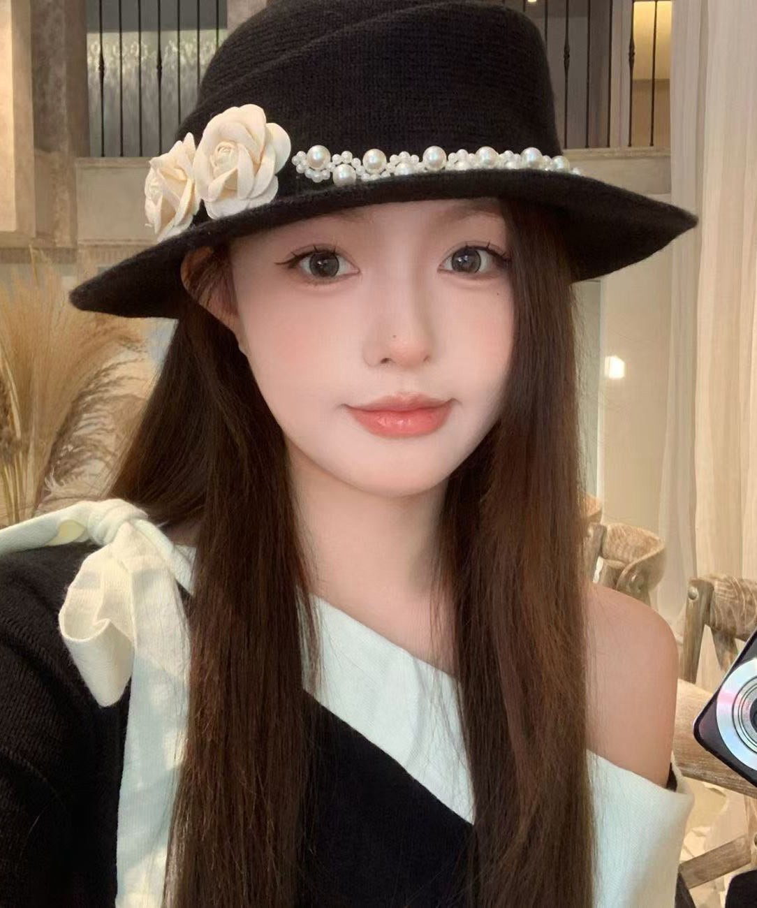 French Elegant Black Pearl Floral Woolen Cloche Hat