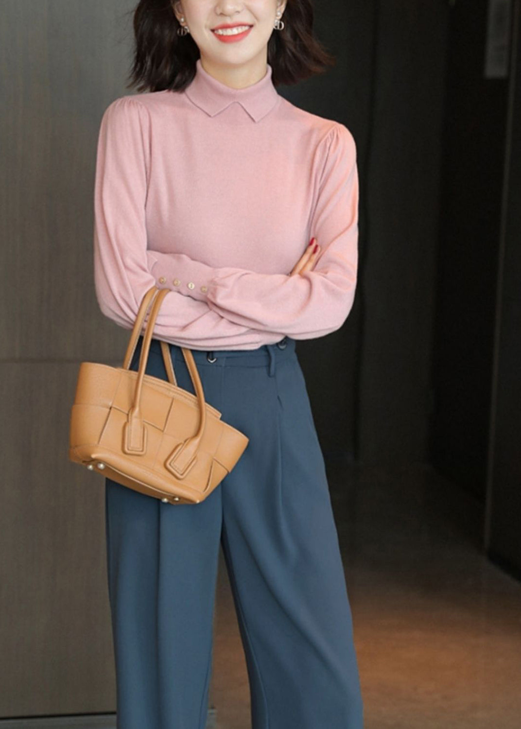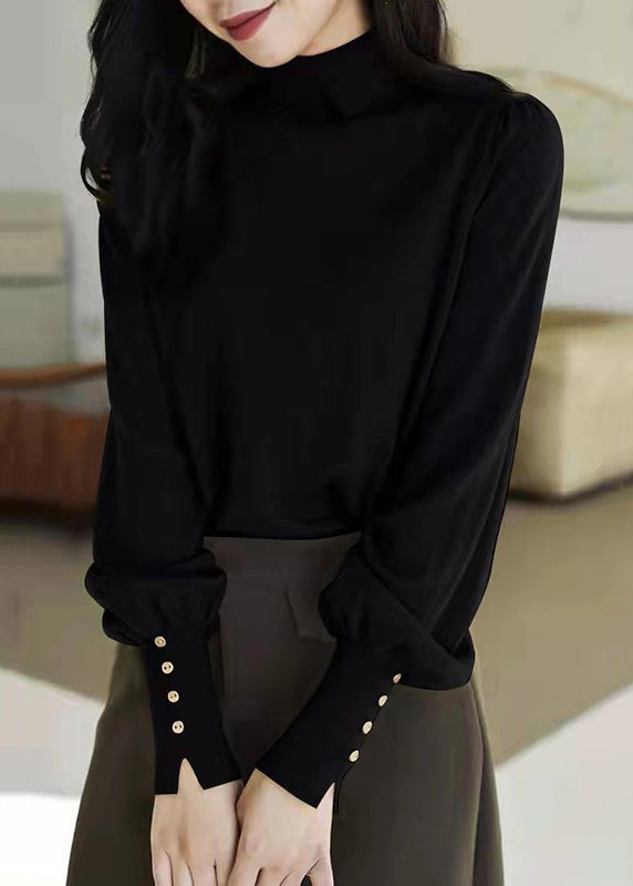French Grey Peter Pan Collar Patchwork Woolen Knitted Tops Lantern Sleeve