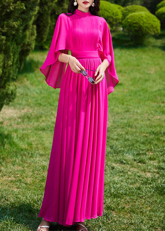 French Red Turtleneck Wrinkled Slim Silk Long A Line Dress Summer