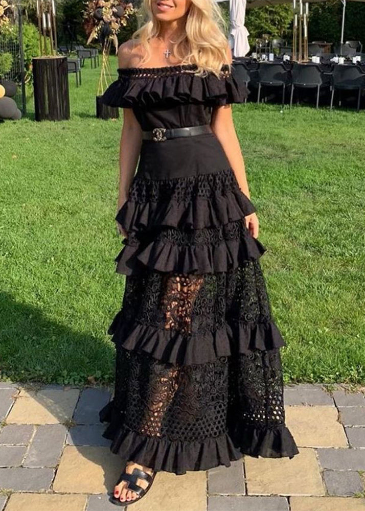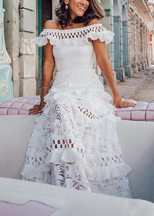 French White Ruffled Hollow Out Lace Maxi Dresses Summer