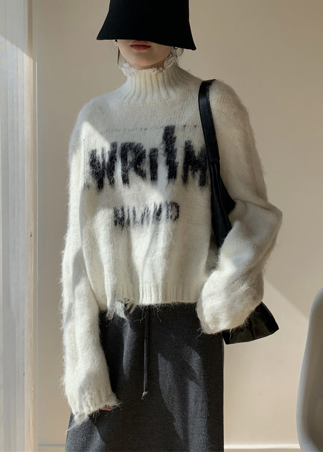 French White Turtleneck Hole Letter Knit Sweater Winter
