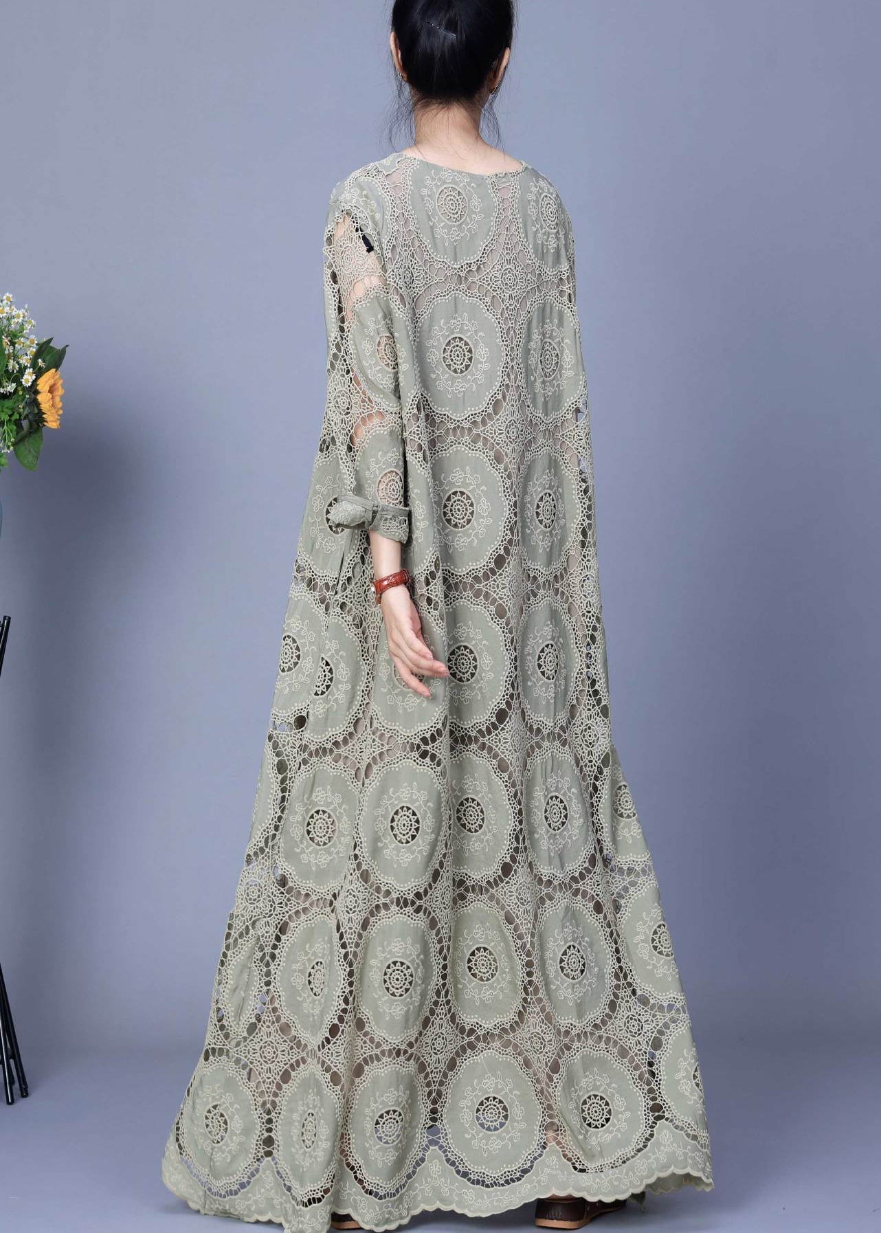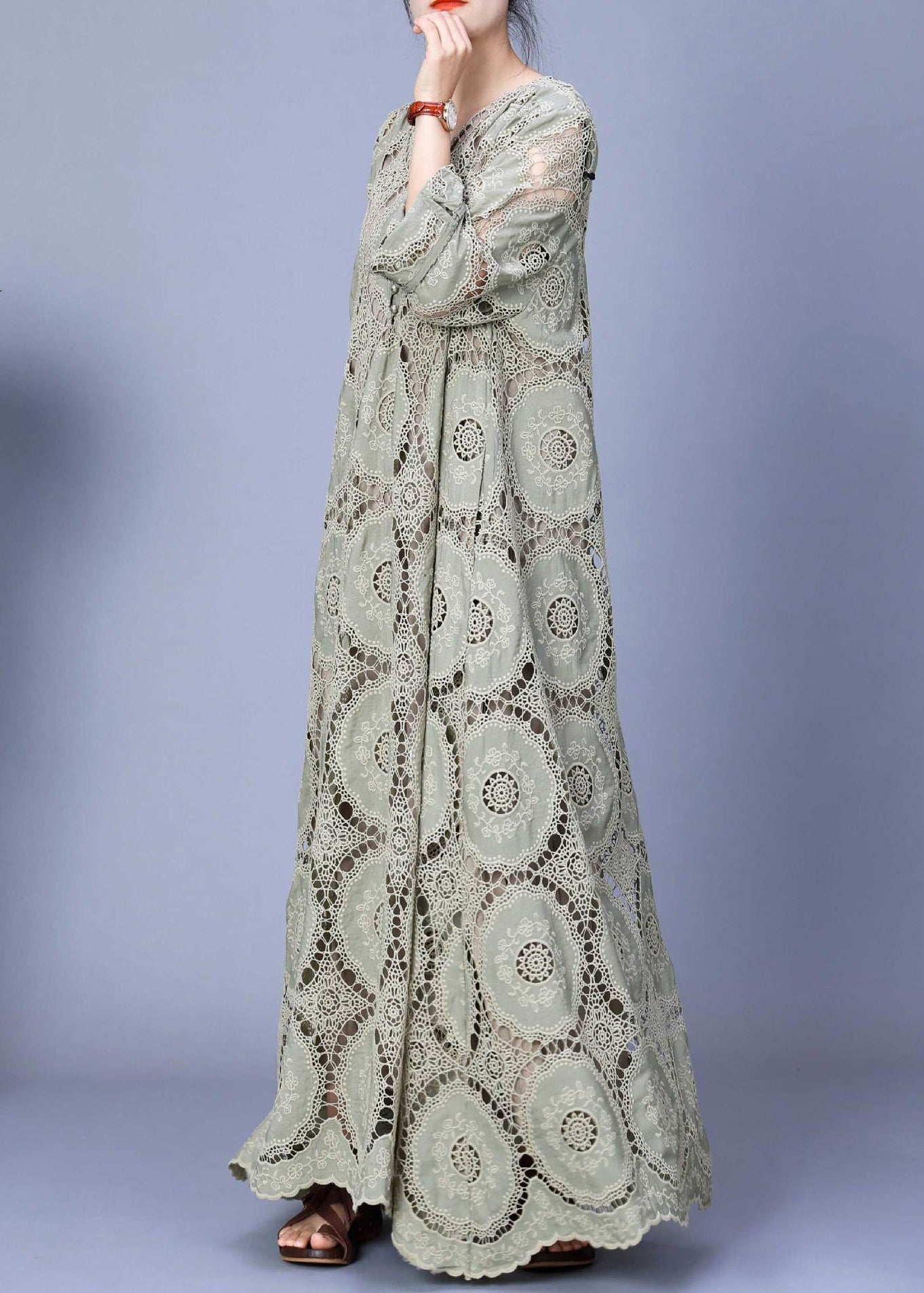 Green Button Pockets Cotton Dresses V Neck Long Sleeve