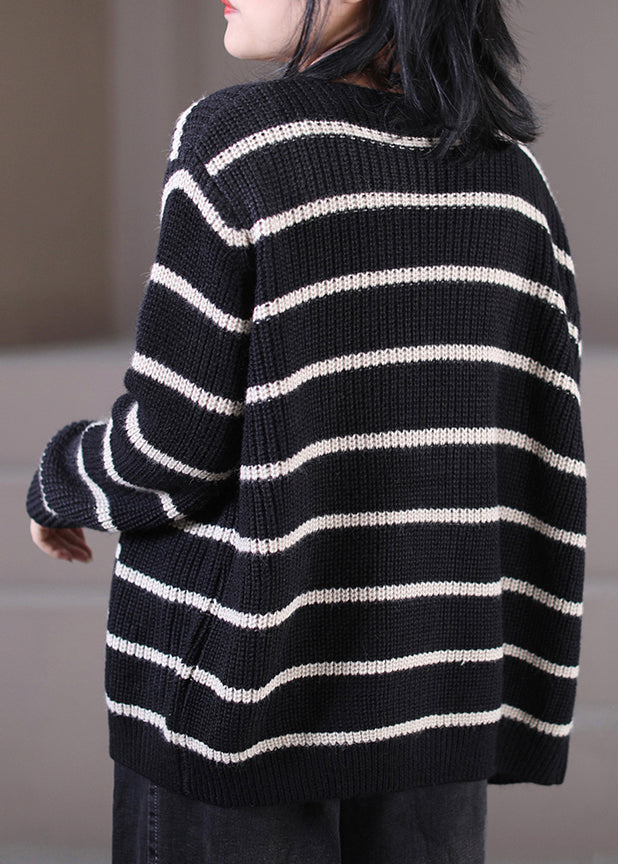 Handmade Black O-Neck Striped Button Knit Sweaters Coats Fall