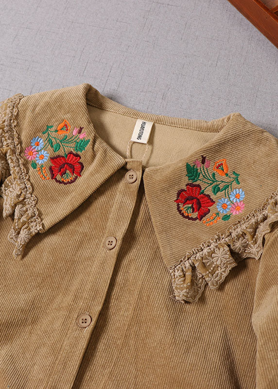 Handmade Yellow Embroideried drawstring Corduroy Maxi Dress Winter