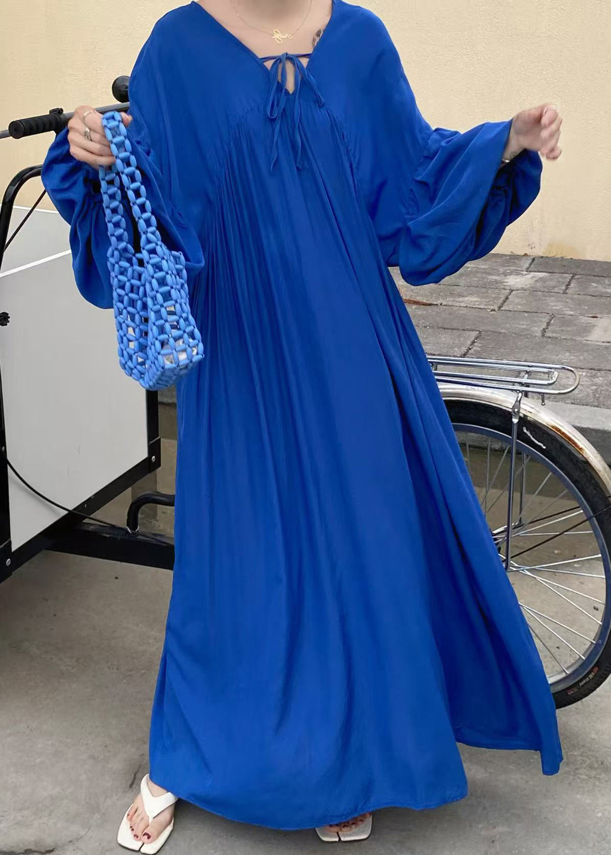 Italian Chocolate Oversized Lace Up Cotton Vacation Dresses Lantern Sleeve