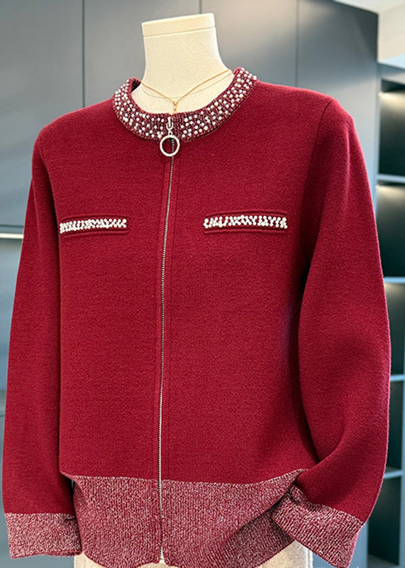 Loose Camel Zippered Nail Bead Cotton Knit Coat Spring